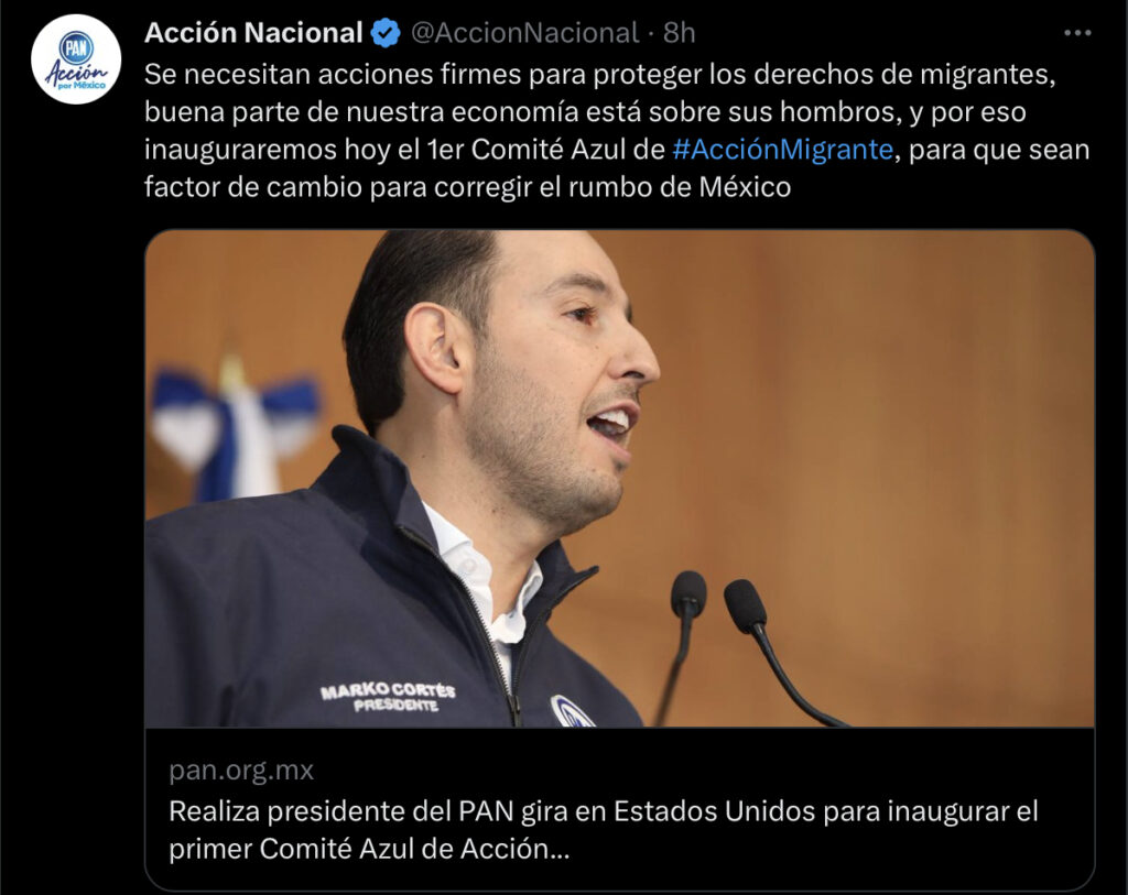 Este domingo 5 de febrero, el Partido Acción Nacional (PAN) informó que su dirigente, Marko Cortés Mendoza, hará una gira por Estados Unidos para inaugurar el primer “Comité Azul de Acción Migrante”.