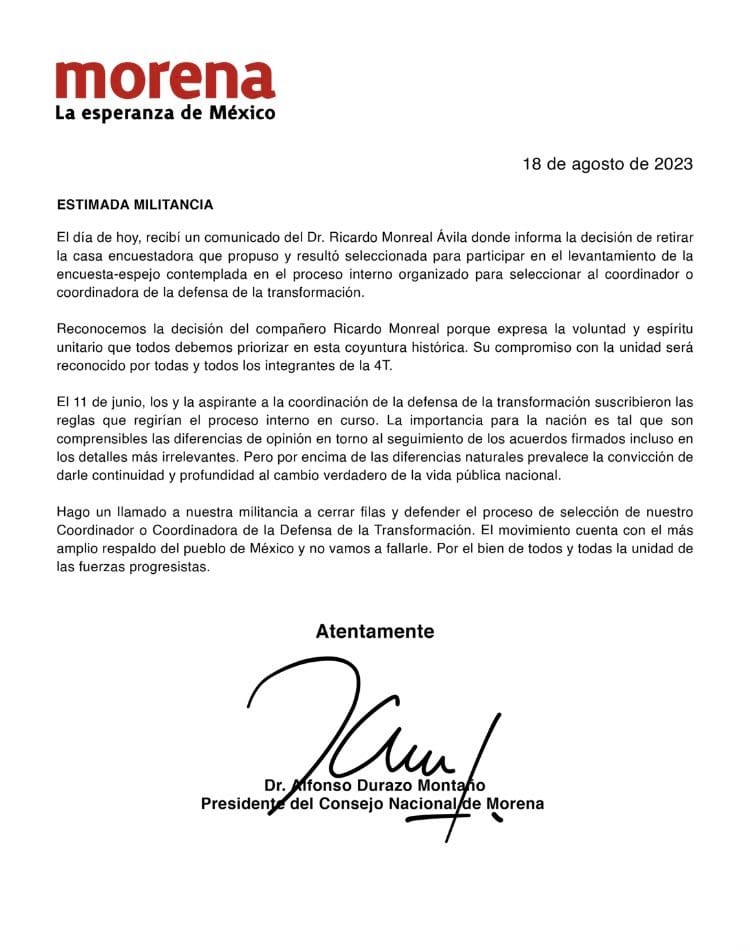El senador y aspirante a la Coordinación en Defensa de la Cuarta Transformación, Ricardo Monreal tomo la decisión de retirar la casa encuestadora que propuso, informó Morena a través de un comunicado.