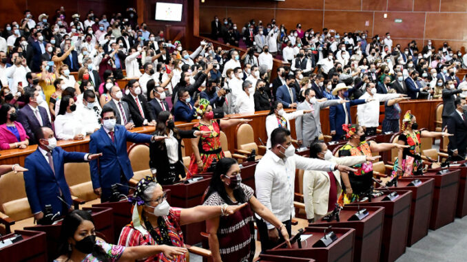 San Raymundo Jalpan, Oax. 13 de noviembre de 2021.- En el Salón de Plenos del Congreso del Estado de Oaxaca tomaron protesta de ley los y las Diputadas que conformarán la 65 Legislatura Local para el periodo 2021- 2023. En un hecho histórico, la Mesa Directiva electa estará integrada únicamente por mujeres, en razón de que ellas son mayoría en esta Soberanía.