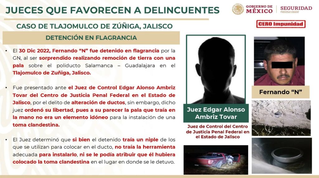 Al presentar su informe quincenal sobre el combate a la criminalidad, exhibió tres casos “en los que se observa a jueces [y magistrados] que favorecen de alguna manera con sus decisiones a los delincuentes”. Todos se relacionan con la extracción ilegal de combustibles en perjuicio de Petróleos Mexicanos y la hacienda pública nacional.