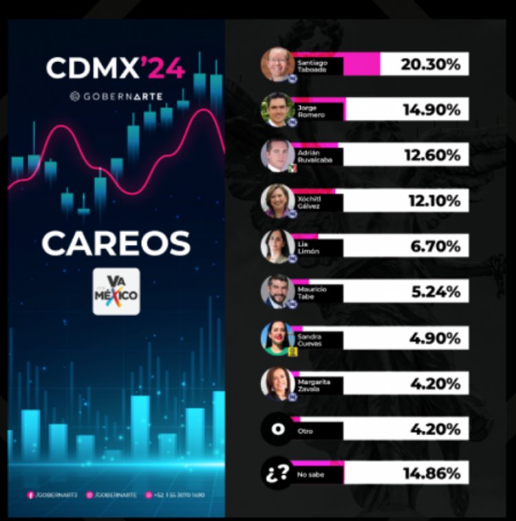 A la cabeza se ubica el alcalde de Benito Juárez, Santiago Taboada, con el 20.30 de las preferencias; seguido del diputado Jorge Romero, con el 14.90 % y Adrián Ruvalcaba con el 12.60 %.