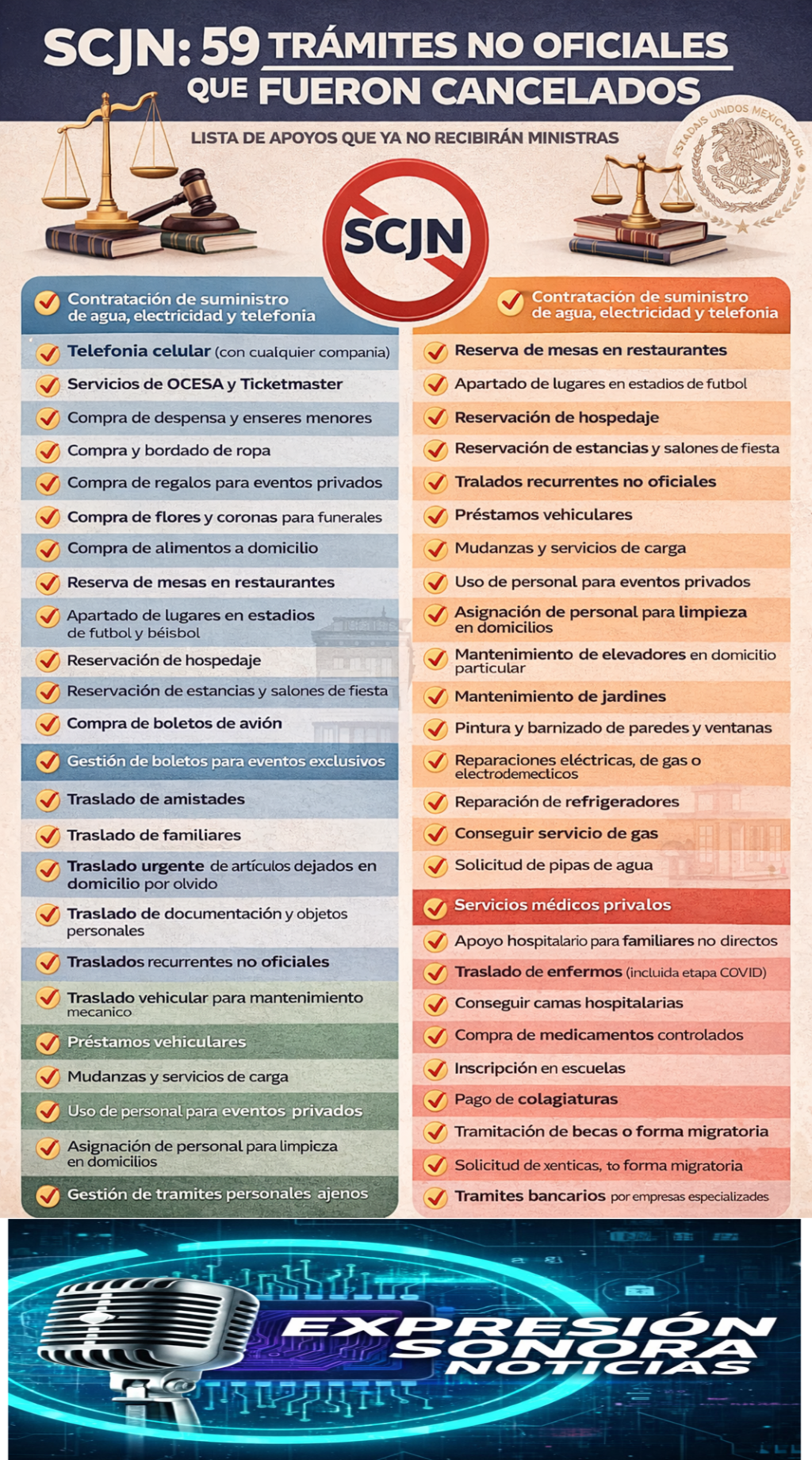 La Suprema Corte de Justicia de la Nación (SCJN) canceló 59 trámites considerados no oficiales dentro del área administrativa encargada de la atención a ministras y ministros, como parte de una revisión interna de servicios y gestiones que no forman parte de las funciones jurisdiccionales.