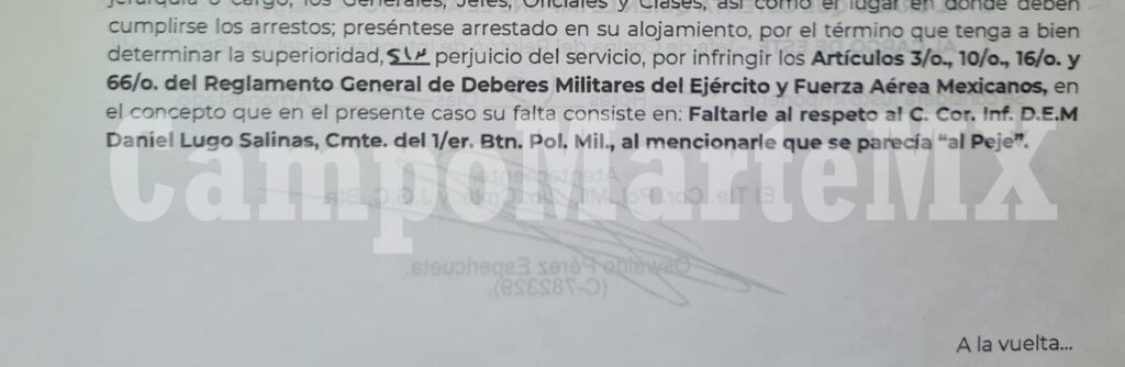 El parte informativo de lo ocurrido señala que el arresto ameritará un término o plazo decidido por ‘la superioridad, sin perjuicio del servicio, por infringir los Artículos 3/°, 10/°, 16/° y 66/º del Reglamento General de Deberes Militares del Ejército y Fuerza Aérea Mexicanos. Los ordenamientos infringidos por el militar son estos: