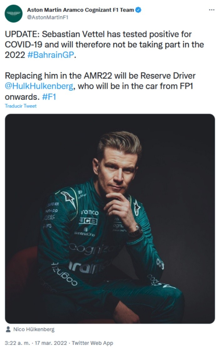 Luego de que Aston Martin informara el positivo de Sebastian Vettel también dio a conocer que será su compatriota, el alemán Nico Hülkenberg, quien lo sustituirá para la carrera de este fin de semana.