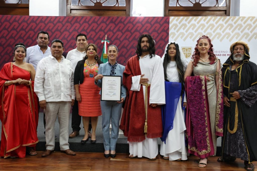 (29 DE MARZO, 2023).- La Jefa de Gobierno, Claudia Sheinbaum Pardo, recibió de la alcaldesa de Iztapalapa, Clara Brugada Molina y del Comité Organizador de Semana Santa en Ixtapalapa A.C. a declaratoria por la cual la Secretaría de Cultura federal y el Instituto de Antropología e Historia (INAH) reconocen a “La Pasión, Muerte y Resurrección de Cristo de Iztapalapa” como Patrimonio Cultural Inmaterial de México.