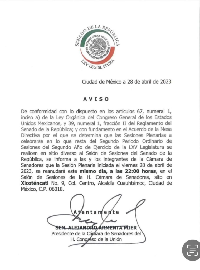 Mediante un comunicado se puede leer como los 128 senadores fueron convocados para la sesión plenaria de este 28 de abril, la cual comenzará en punto de las 22:00 horas.