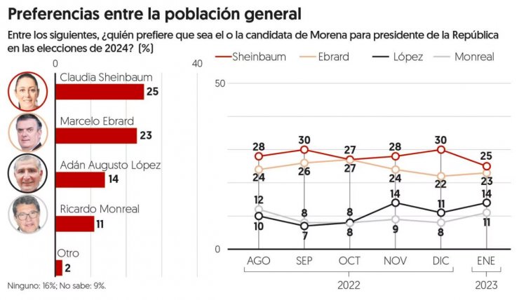 Al cuestionamiento de a quién de los cuatro prefieren como candidato presidencial de Morena en 2024, el apoyo a Sheinbaum bajó 5 puntos, al pasar de 30 a 25% entre diciembre y enero. Mientras que Ebrard avanzó 1 y se posicionó en 23%, 2 puntos por detrás de la jefa de Gobierno, quien el mes anterior superaba al canciller por 8 puntos. Adán Augusto pasó de 11 a 14% y Monreal de 8 a 11%.