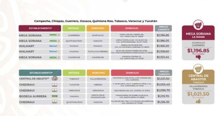 Los establecimientos con la venta de estos productos de lista más más cara se da en el Mega Soriana La Diana en Acapulco, Guerrero con un precio de 994.05 pesos; el lugar con la canasta más barata se encuentra en en la central de abasto de Tabasco, en Villahermosa con un precio de 807.90 pesos.