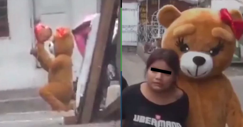 La creativa detención tuvo lugar en el distrito San Martín de Porres de la ciudad de Lima (Perú), donde un uniformado se disfrazó de oso gigante para atraer la atención de la sospechosa, quien al momento de salir para ver quien le llevaba serenata, fue detenida por el mismo “regalo”.
