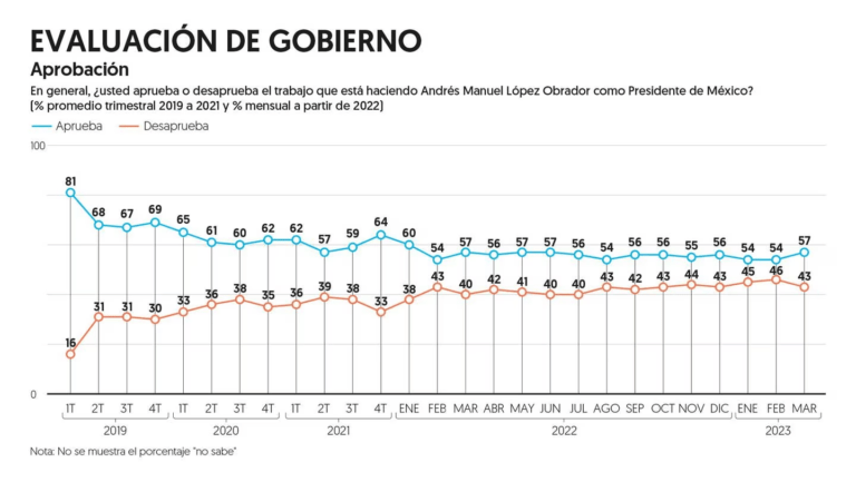 Regeneración, 4 de abril de 2023. El diario El Financiero dice que la aprobación del presidente Andrés Manuel López Obrador subió tres puntos porcentuales en marzo.