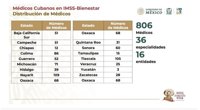 Por el momento se encuentran 806 médicos de 36 especialidades distribuidos en 16 entidades. Destacó que los estados con el mayor número de médicos cubanos con Nayarit y Tlaxcala, con 109 y 105 especialistas respectivamente. Colima, con 86, Michoacán, con 71 y Oaxaca con 68.