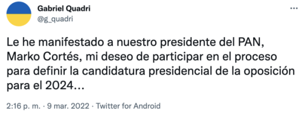 Tiempo de lectura: < 1 minutoPortada: El Chamuco (09 DE MARZO, 2022).- Este miércoles, Gabriel Quadri, diputado federal del PAN,...