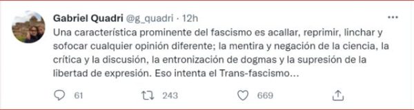 Pese a protestas, Quadri redobla discurso de odio contra comunidad LGBTTTIQ+ y acusa “transfascismo”