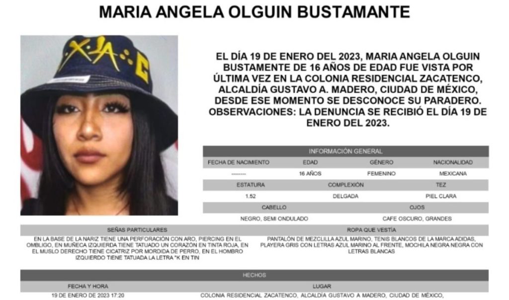 (20 DE ENERO, 2023).- La joven María Angela Olguín Bustamante fue vista por última vez afuera de unos sanitarios del metro Indios Verdes, en la colonia Residencial Zacatenco, en la alcaldía Gustavo A. Madero.