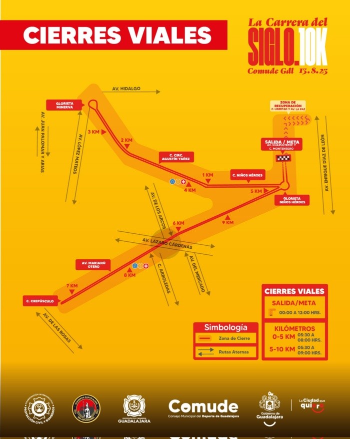 Ahí se dará el disparo de salida a las 6 de la mañana, por lo que los corredores tomarán Niños Héroes, luego Agustín Yánez rumbo a La Minerva, de ahí rodearán la glorieta y regresarán de igual forma por Agustín Yáñez y luego Niños Héroes para después tomar Mariano Otero, hasta la calle de Crespúsculo y regresar en U por Mariano Otero rumbo a Chapultepec y Montenegro, donde estará la meta.