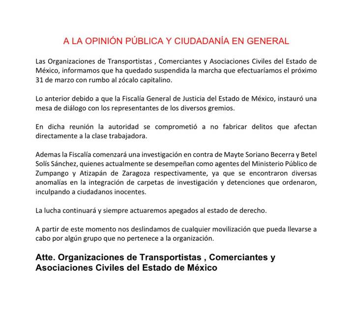 A través de redes sociales comenzó a circular el aviso de los transportistas sobre una protesta en contra de la Fiscalía General de Justicia del Estado de México por supuesta fabricación de delitos.