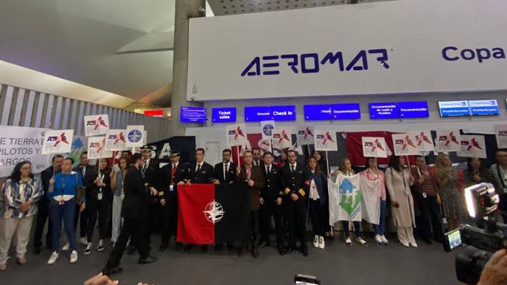Cerca de las 18:00 horas, asociaciones sindicales de pilotos y sobrecargos colocaron las banderas rojinegras en los mostradores de la ahora extinta Aeromar.