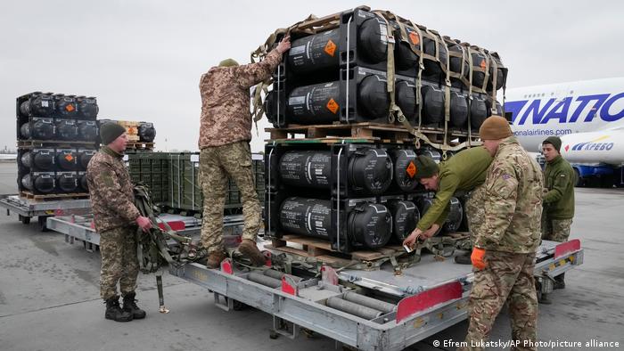 Militares ucranianos desempacan misiles antitanque enviados por Estados Unidos como parte de la asistencia de seguridad.
