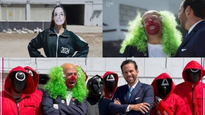 Allí se encuentran hombres con armas y los conocidos trajes rojos; así como seis personas con el traje verde de los participantes en “El Juego del Calamar”.