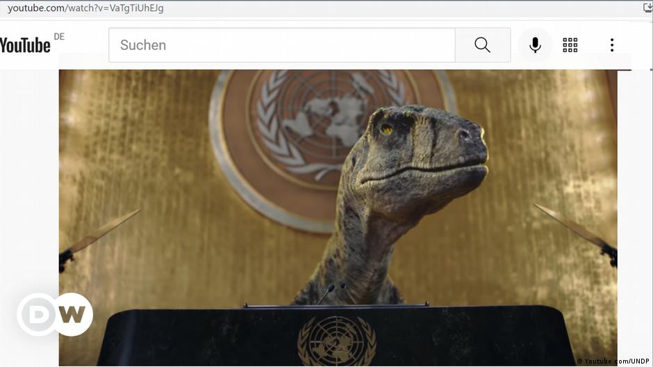 En una original campaña sobre la crisis climática, la Organización de las Naciones Unidas (ONU) utiliza la «experiencia» de un dinosaurio que irrumpe el hemiciclo de la Asamblea General para expresar su estupefacción por el hecho de que los humanos se estén extinguiendo a sí mismos