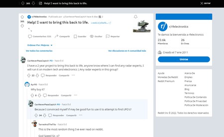 Entre quienes reaccionado a su SOS en Reddit hay también quien plantea usar el radar para escanear la luna y quien, simplemente, señala las complicaciones de poner en marcha el viejo Type 84. «Es probable que funcione a una potencia y frecuencia restringidas, ¿no? En ese caso, se necesitaría una licencia; ¿es fácil conseguirla?», plantea un usuario.