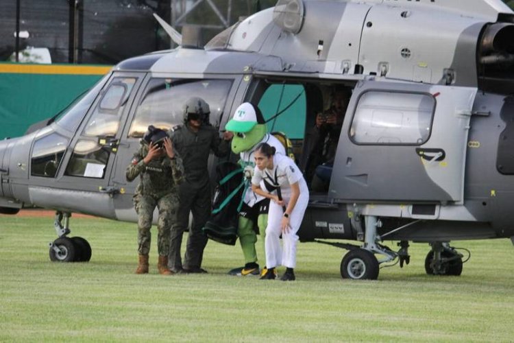 Un helicóptero tipo Panther de la Secretaría de la Marina (Semar) fue utilizado para transportar a “Pochicoco”, la mascota del equipo de béisbol de la Liga Mexicana de Béisbol (LMB), los Olmecas de Tabasco, al Estadio Ángel Cuco Toledo, que estaba celebrando la inauguración de un partido en contra de los Tigres de Quintana Roo.