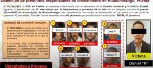 El subsecretario de seguridad Ricardo Mejía ciudadana dió a conocer la aprehensión de dos hombres por lo que ya suman nueve detenidos por el linchamiento del abogado Daniel «N» en Puebla, quien fue acusado por los ciudadanos de robar niños