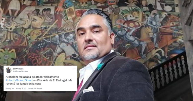 «Atención: Me acaba de atacar físicamente #HectorSuarezGomiz en Plza Artz de El Pedregal. Me reventó los lentes en la cara», escribió el periodista.