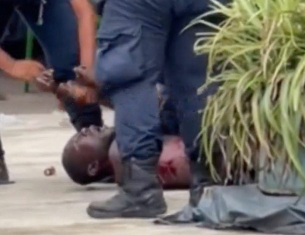 El hombre termina recostado en el suelo indefenso, pero continúan dándole descargas en la espalda. Al final del video, se ve que el migrante está ensangrentado; supuestamente, fue detenido por un robo.