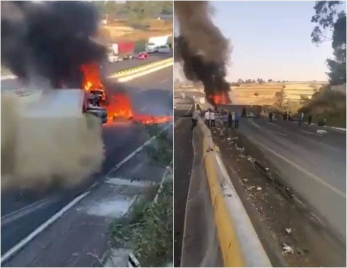 Un video compartido por el usuario @fco_balbuena muestra el fuerte incendio del tráiler sobre la carretera México-Puebla.