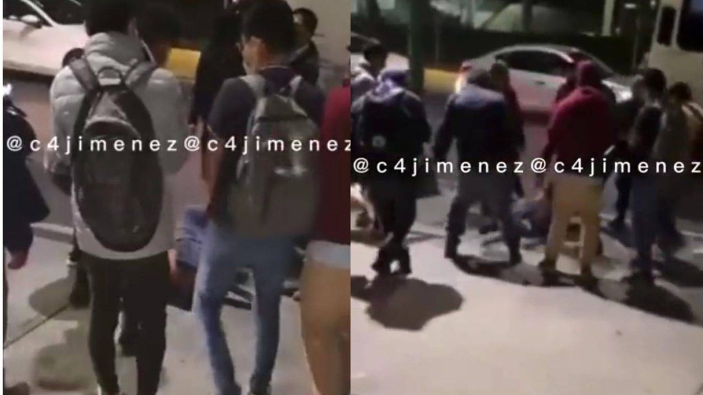 Mientras que el ladrón trato de huir, pero lo detuvieron los usuarios del transporte público, quienes lo tiran al suelo y lo golpean.