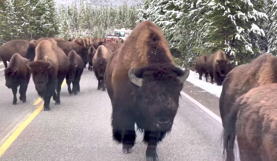 Armados de un pelaje grueso que adopta un tono más oscuro en la temporada invernal y capas de grasa que les permiten soportar las bajas temperaturas, las manadas se mueven hacia el sur sin importar si en su ruta migratoria atraviesan alguno de los caminos pavimentados del Parque, que comprende los estados de Wyoming, Idaho y Montana.