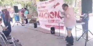 En la grabación que circula en redes sociales, se puede ver a Javier Borrego en un templete, mientras tiene en sus manos un micrófono; pero el discurso del legislador se vio interrumpido, porque se le cayeron los pantalones.