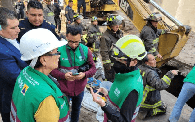 Los bomberos de la CDMX emprendieron labores para rescatar a tres hombres que habían quedado atrapados después de que el terreno presuntamente habría cedido. Uno de ellos fue rescatado con éxito, mientras que a otro se le tuvo que brindar equipo de respiración autónomo.