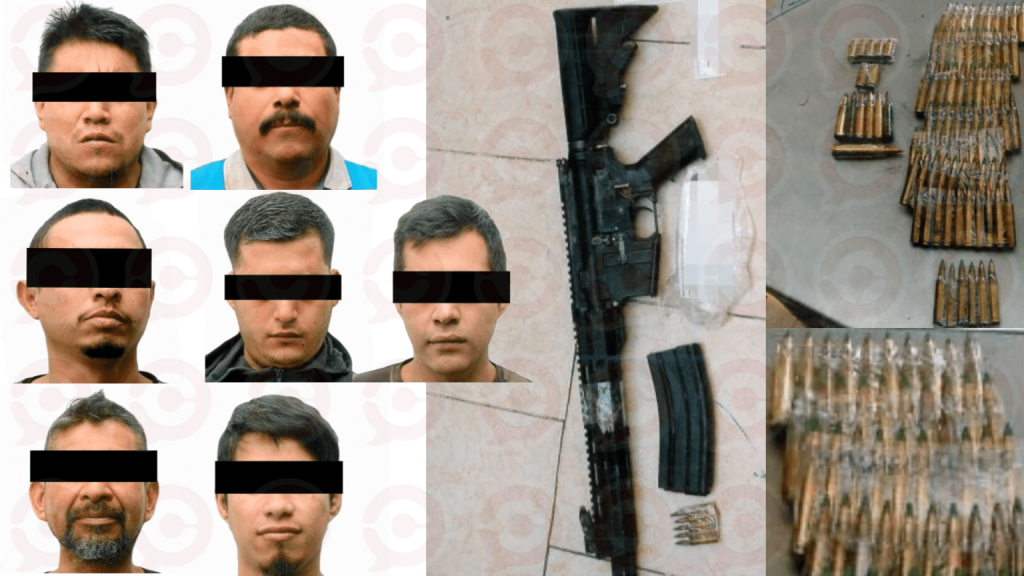 Las personas vinculadas son: Carlos “R”, Nicolas “M”, José “S”, Yarel “C”, Geber “P”, Ubaldo “CH” y Luciano “CH”; a quienes se les aseguraron un fusil calibre .223, siete fusiles calibre 7.62 x 39 “cuerno de chivo”; 726 cartuchos útiles, 33 cargadores, 8 chalecos tácticos y 16 placas balísticas.