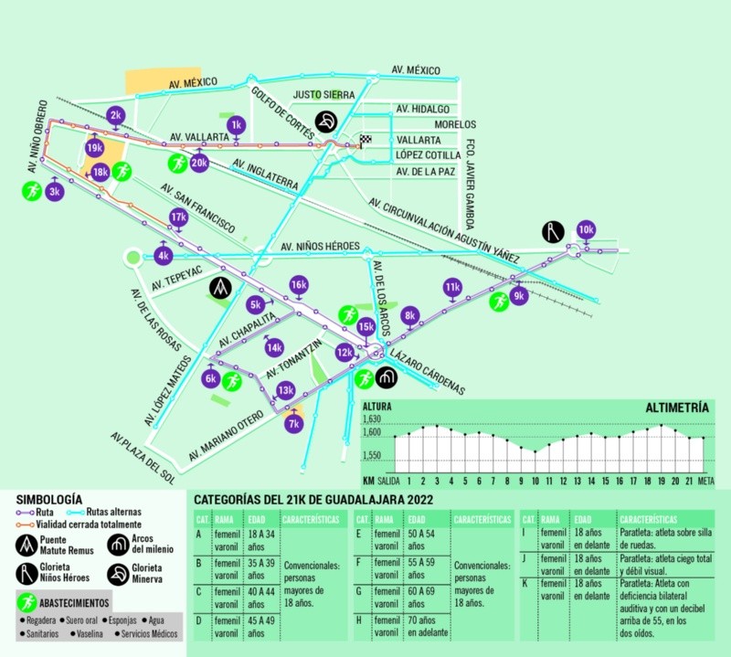 Este 21K tapatío tendrá como salida y meta le Glorieta de La Minerva. El disparo de salida será a las 6:20 horas para la categoría paratletas, a las 6:30 horas para la categoría de atletas de élite y atletas clasificados, y a las 6:35 para atletas convencionales.