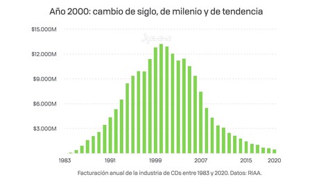 Pero fue en el año 2000 -hace aproximadamente esos veinte años de la creencia popular en los ciclos de las modas- en el que las cifras de ventas de los CDs llegaron a su máximo en ventas (más de 13.000 millones de euros en Estados Unidos, según la RIAA) y sustituyeron por completo al cassette como estándar para el almacenaje y reproducción de música. Desde ahí se inició un lento descenso que ha llevado a unos ingresos de unos 483 millones de dólares en el año 2020, último del que se tienen registros.
