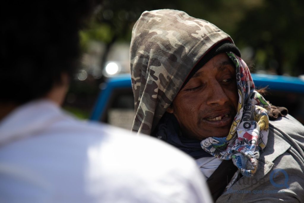 Parece contradictorio, pues pese al calor carga con varias capas de ropa vieja, prácticamente de harapos. Pero cuando nos dice que duerme en la calle todo cobra sentido: esa indumentaria lo protege de las gélidas temperaturas que en ocasiones caen de madrugada por la extremosa capital queretana.