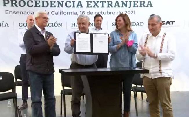 Regeneración, 16 de octubre de 2021. El presidente, Andrés Manuel López Obrador (AMLO) realiza una gira de trabajo por Baja California, estado en el que firmó hoy el decreto que permitirá regularizar miles de vehículos importados de manera irregular de Estados Unidos.