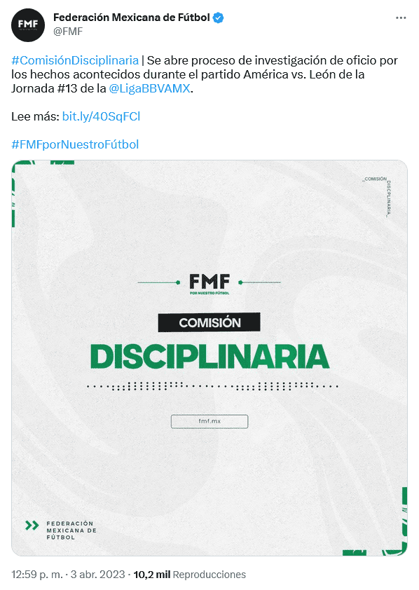 «La Comisión Disciplinaria informa que, con fundamento en lo dispuesto por el artículo 86 del Reglamento de Sanciones 2022 – 2023, inició de oficio un procedimiento de investigación por los hechos acontecidos durante el partido disputado el pasado 1 de abril de 2023, correspondiente a la Jornada 13 del Torneo Clausura 2023 de LIGA MX, entre los Clubes América y León. Lo anterior, con la finalidad de otorgarle a las partes involucradas su derecho de audiencia y la Comisión Disciplinaria disponga de todos los elementos necesarios. Una vez que esta Comisión realice el análisis de las pruebas y demás documentos aportados, emitirá la resolución correspondiente», dice el comunicado.